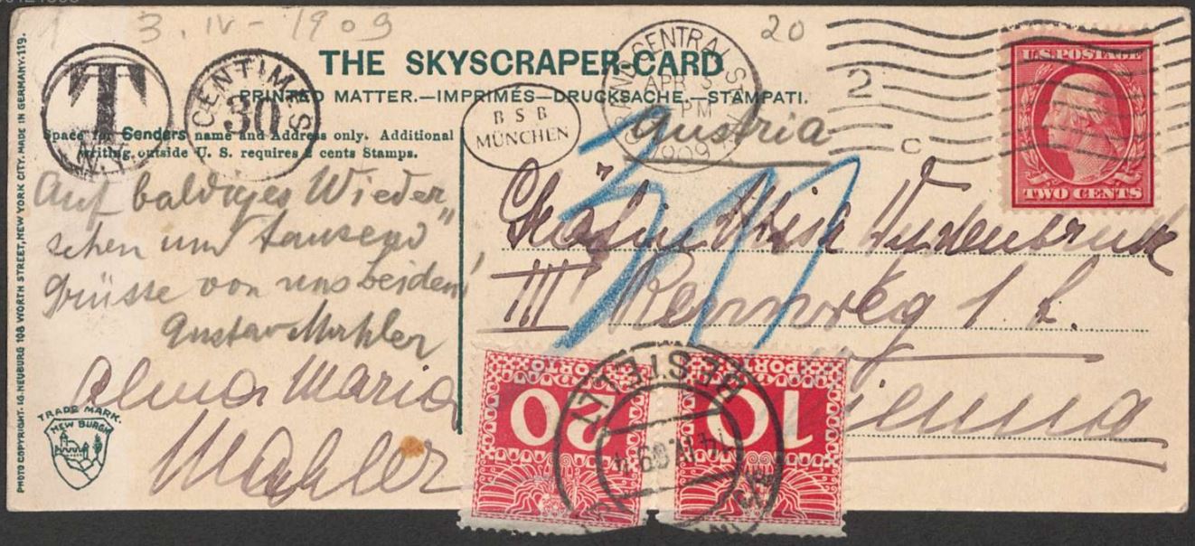 03-04-1909. Postcard to Grafin Maria Misa von Wydenbruck-Esterhazy (1859-1926). The Skyscraper Card. Gustav and Alma Mahler.
