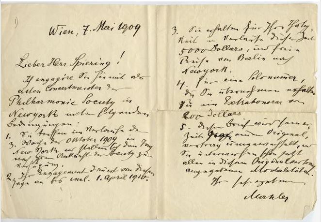 Vienna, 7 May 1909 Dear Mr. Spiering, I am herewith engaging you as first concertmaster of the Philharmonic Society of New York under certain stipulations. 1. You will be in New York the third week of October 1909, and the day after your arrival you will present yourself to the Society and you will be at their disposal. 2. Your contract will be from this date to April 1, 1910 inclusive. 3. You will receive as a salary $5000.00 and a free trip from Berlin to New York. 4. For a solo number that you play you will receive $200.00 extra. Yours very sincerely, Gustav Mahler