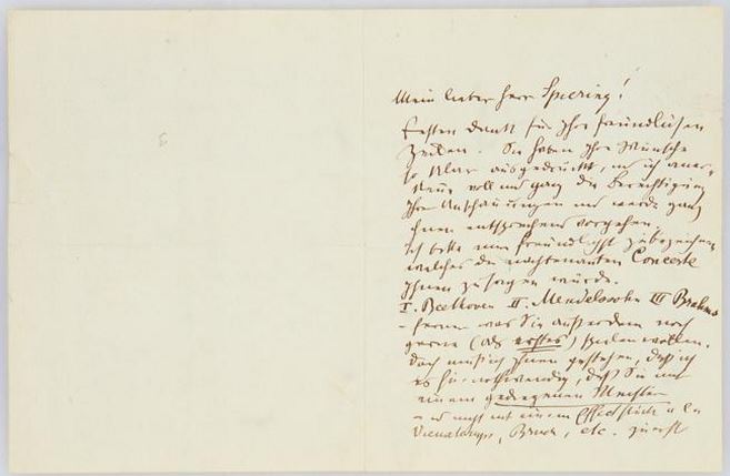 My Dear Mr. Spiering: Many thanks for your friendly lines. You have expressed your wishes so clearly, and I recognize fully the justification of your viewpoint and will go ahead as you suggest. I only ask you kindly to designate which of the listed concertos will appeal to you. I – Beethoven – II – Mendelssohn – III – Brahms – furthermore what you would like to play first (aside from the above). But I must acknowledge that I consider it necessary to begin with a work of sterling merit and not with a bravura piece a la Vieuxtemps, Bruch, etc.