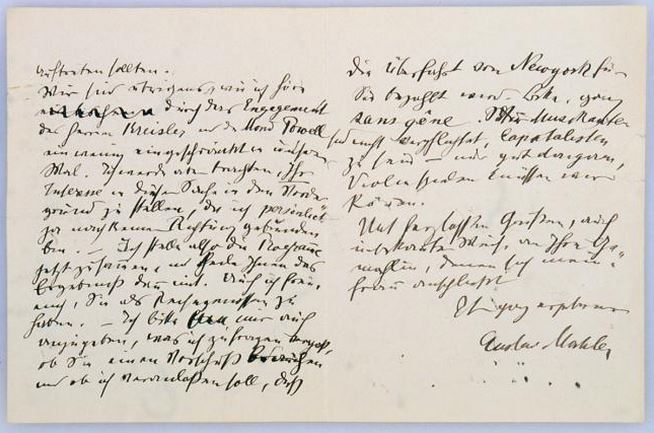 We are somewhat handicapped in our choice due to the engagement of Mr. Kreisler and Maud Powell, but I shall try however to give you the first consideration in this regard, since I am not bound in any way. I am now planning my programs, and shall send you the result. I too am looking forward to having you as my traveling companion. I forgot to mention and I ask you to let me know whether you would like to have some pay in advance and whether you would like to have me arrange that your passage is paid from New York. Please be perfectly frank. We musicians are not expected to be capitalists – we only have to be able to conduct well or play the violin well. My wife joins me in sending hearty greetings to you and to your wife. Mahler