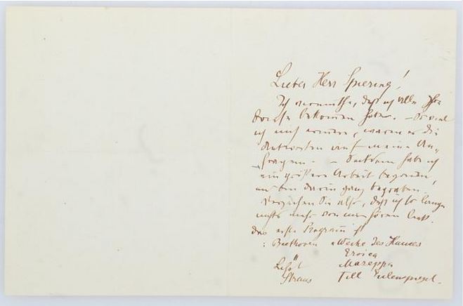 Dear Mr. Spiering: I take for granted that you have received all of your letters as far as I can remember they were the answers to my inquiries. Since then I have started a lengthy composition, in which I am completely buried. Will you please excuse therefore that you have not heard from me for so long. The first program will be: Beethoven – Consecration of the House Beethoven – Eroica Liszt – Mazeppa Strauss – Till Eulenspiegel