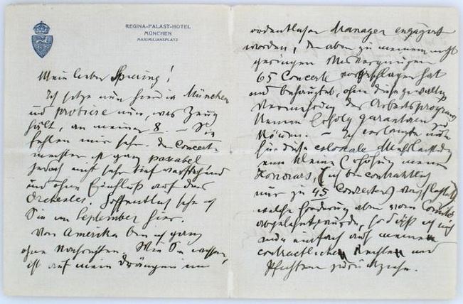 My Dear Spiering: I am sitting here in Munich and am rehearsing to the utmost of my strength on my Eighth Symphony. I miss you very much. The concertmaster is fair, but without any deeper understanding and has no influence on the orchestra. I hope that I shall see you here in September. I have received no news from America. As you know, due to my insisting, a good manager has been engaged, but to my displeasure he has suggested and arranged 65 concerts for the season. He maintains that without this increase in concerts he will not be able to insure a financial success. I asked for a small increase of my salary, on account of the added amount of work. My contract only calls for 45 concerts. My request however, was not granted by the committee, so I shall just have to abide by my contract. I have submitted my decision to the committee, but have heard nothing since then. I greet you heartily and thank your wife for her dear lines. I hope that I shall meet her this year. My wife also sends hearty greetings. Mahler