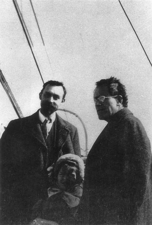 Year 1909. Theodore Spiering (1871-1925), Anna Justine Mahler (Gucki) (1904-1988) and Gustav Mahler at sea, from Europa to New York.