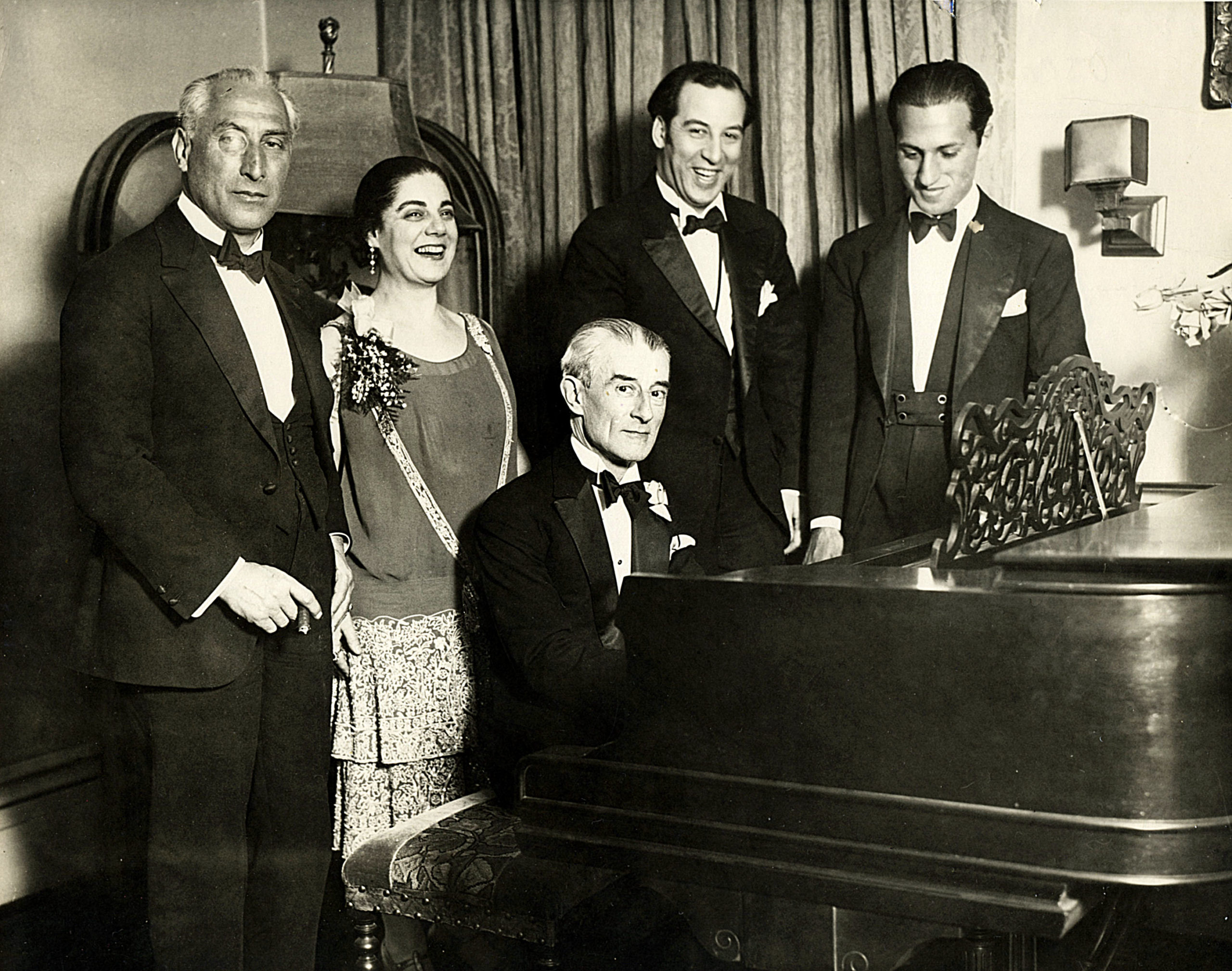 Birthday party honoring Maurice Ravel in New York, 08-03-1928. From left to rigt: Oskar Fried (1871-1941), Eva Gauthier, Joseph Maurice Ravel (1875-1937) (at the piano), Manoah Leide-Tedesco and George Gershwin.