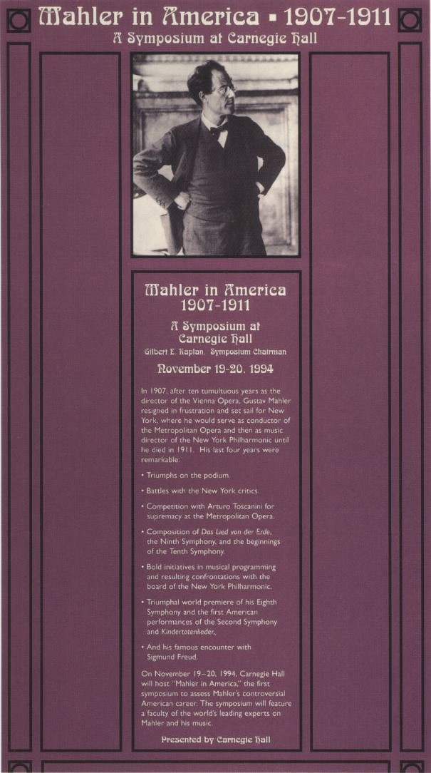 - 1994: Carnegie Hall. Symposium Mahler in America 1907-1911. Gilbert Kaplan (1941-2016) chairman. 19-11-1994 and 20-11-1994. The first symposium to assess Mahler’s controversial American career. Faculty of the world’s leading experts on Mahler and his music. Presented by Carnegie Hall.