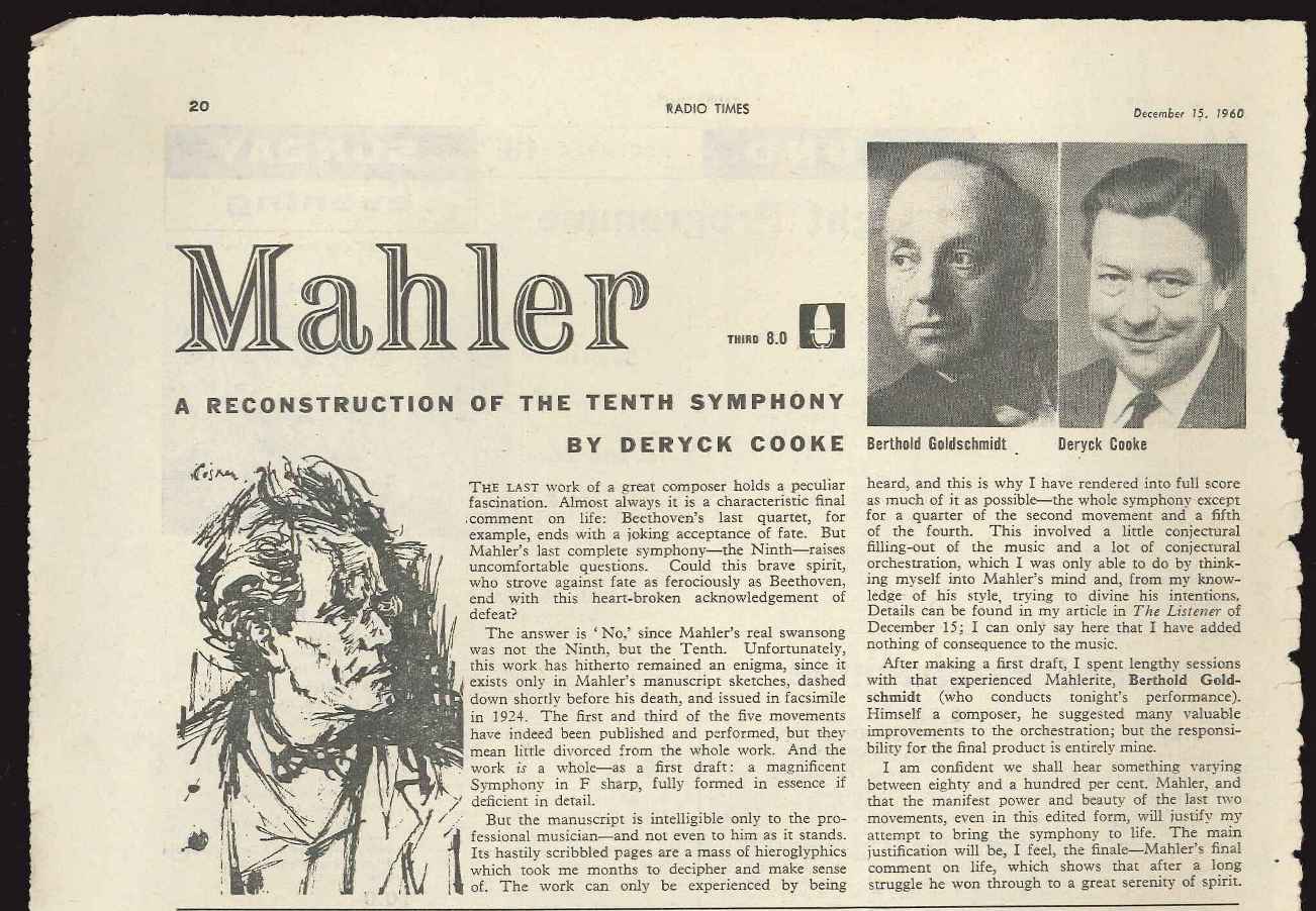 Beginning in the run-up to the Mahler centenary in 1960, Cooke (in association with Berthold Goldschmidt) made his first attempt at producing a ‘performing version’ of the unfinished draft of Mahler’s 10th Symphony. Originally a lecture demonstration broadcast by the BBC in 1960, the first full (continuous) version was premièred on 13 August 1964 at The Proms by the London Symphony Orchestra under the baton of Goldschmidt. Revised editions followed, with the composers David Matthews and Colin Matthews assisting Cooke and Goldschmidt in the attempt to produce an authentically Mahlerian orchestration. Finally seen into print by Cooke and his collaborators in 1976, the work has now become a part of the repertoire.