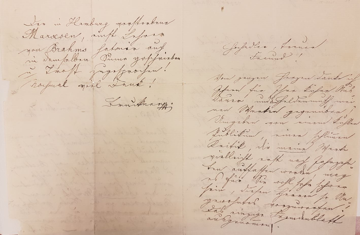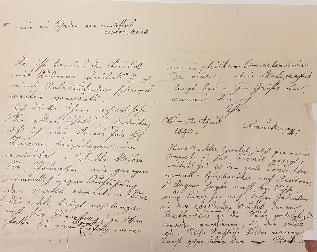 07-04-1893, Year 1893. Letter received by Gustav Mahler (1860-1911) from Anton Bruckner (1824-1896). Thanks Mahler for his Good Friday (31-03-1893) performance of his Te Deum and Mass in D minor, and for his support against his critics.