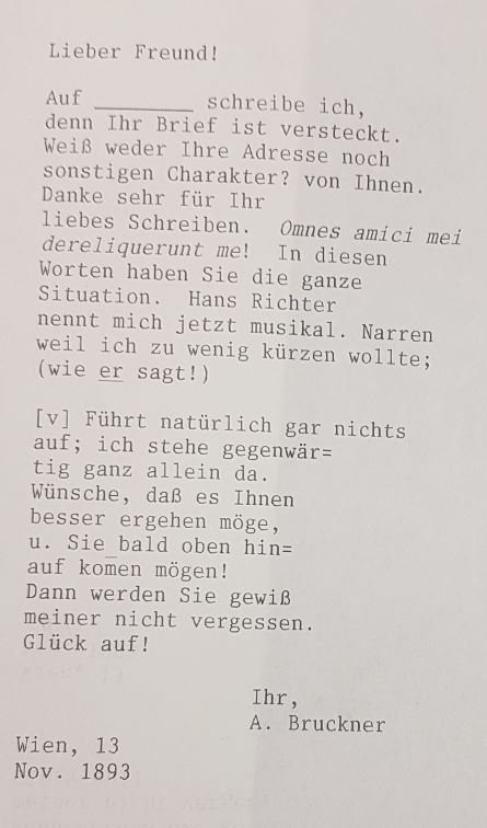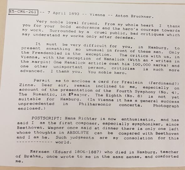 13-11-1893, Year 1893. Letter received by Gustav Mahler (1860-1911) from Anton Bruckner (1824-1896). Photostat. Hans Richter (1843-1916) has called him a fool for refusing to make further cuts.