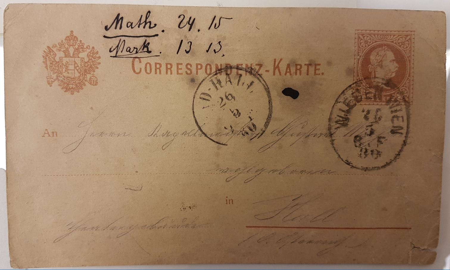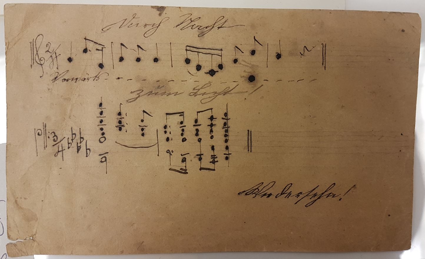 Year 1880. Card received by Gustav Mahler (1860-1911) from Anton Bruckner (1824-1896). Unsigned card, with two lines of music: a fragment of the trio in the march in Franz von Suppe (1819-1895)‘s Faninitza, and the Valhalla theme from Richard Wagner (1813-1883)‘s Ring. References to the bible verses Mattew 24:15 and Mark 13:13.