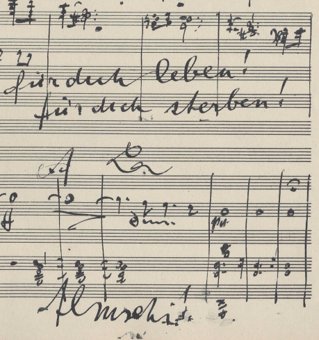 On the last page, left, at a point where the music strikes a particularly harrowing note, with the searing melodic leap (B sharp – G sharp), these simple words utter Mahler’s despair and his undying love, over the very last measures.