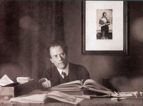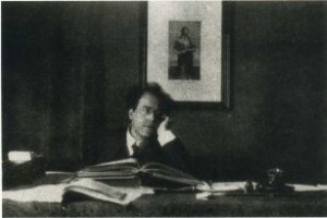 92. 1907. Rome. Mahler at work at his desk studying scores for two concerts he conducted here in 03-1907 and 04-1907 with the Orchestra di Santa Cecilia. At one of the concerts he performed Movement 4: Adagietto. Sehr langsam of Symphony No. 5 as a separate work.