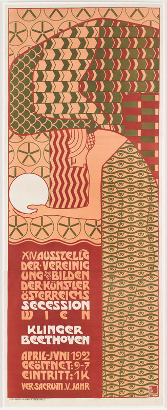 - The exhibition centered around Max Klinger’s Beethoven statue placed in the main hall. In addition to Klimt’s Beethoven Frieze, wall paintings and decorations by Alfred Roller, Adolf Böhm, Ferdinand Andri and numerous other artists were presented. The declared aim of the exhibition was to reunite the separate arts – architecture, painting, sculpture and music – under a common theme: the “work of art” was to emerge from the interplay of the design of the rooms, the wall paintings and sculpture. Klimt’s monumental wall cycle was located in the left-hand aisle, which visitors to the exhibition entered first. An opening in the wall offered a view of Max Klinger’s Beethoven statue, indicating the interplay of architecture, painting (Klimt’s Beethoven Frieze) and sculpture (Klinger’s Beethoven) as soon as the visitor entered.