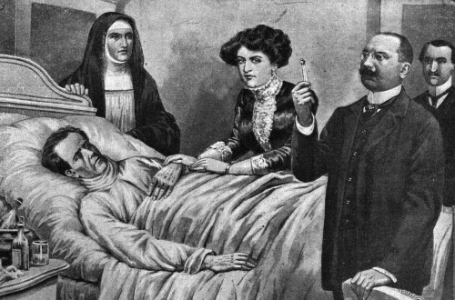 Year 1911. Engraving in Morgenblatt (17-05-1911) that appeared under the headline “Gustav Mahler on his Deathbed” on the day before Mahler died. Vienna, Low sanatorium.