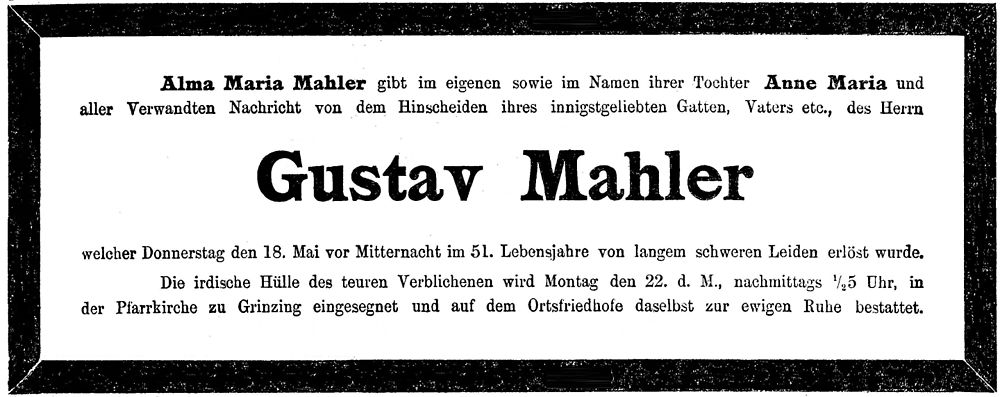 19-05-1911 Obituary Gustav Mahler (1860-1911) by Alma Mahler (1879-1964) and Anna Justine Mahler (Gucki) (1904-1988) (Anne Maria).