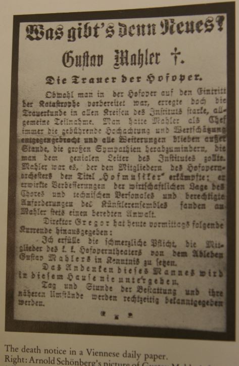18-05-1911 Article in Morgenblatt: The night had passed quietly. Mahler was given warm milk and a low dose to aid his sleep. In the morning he drank coffee and his temperature slowly began to drop. But the end was near and Mahler’s lack of response to questions and to the drugs was indication of the advanced stages of kidney, lung and heart failure. Mahler lay with dazed eyes; one finger was conducting on the quilt. There was a smile on his lips and twice he said: ‘Mozart!’ His eyes were very big. I begged Chvostek to give him a large dose of morphia so that he might feel nothing more. He replied in a loud voice. I seized his hand: ‘Talk softly, he might hear you.’ – ‘He hears nothing now.’ Alma’s recollections have her customary theatricality, but Bruno Walter (1876-1962) was equally dramatic in his description of the ‘horrible struggle with death’ during the composer’s final hours.