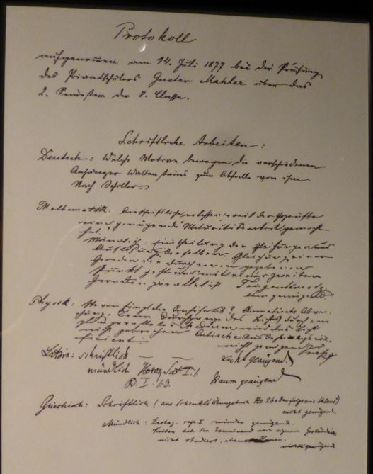 Year 1877. Mahler’s examination schedule 14-07-1877 at the School German Gymnasium (Hluboka street Nos. 1/109, Nonnengaschen 608): Failed.