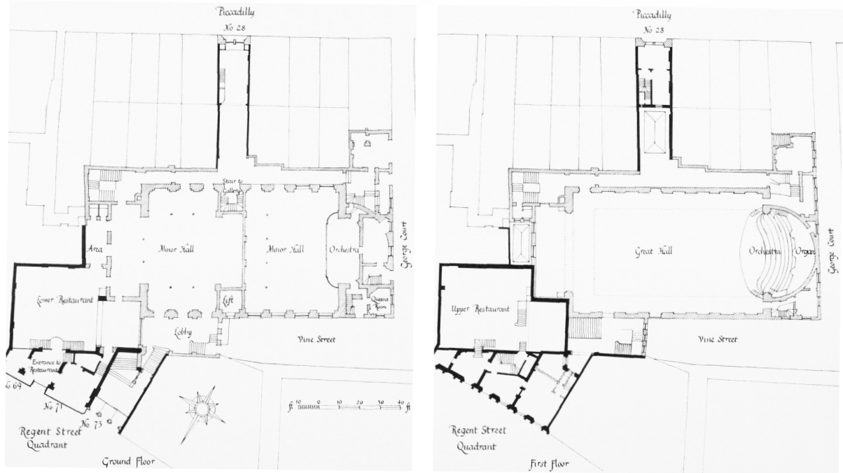 In 1885 the Metropolitan Board of Works decided that the hall was ‘so defective in its structure that special danger from fire may result to the public frequenting the same’, and therefore required the company to make thirty modifications, mostly in order to improve access. In 1899 the London County Council required a further twenty-nine alterations. At about the same time the Council was also considering the widening of the north side of Piccadilly between the Circus and Sackville Street, and the company therefore decided to modernize their premises and make very extensive alterations.