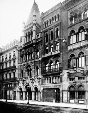 The catering side of the business was greatly enlarged in 1874-1875 by the acquisition and rebuilding of Nos. 24–26 (consec.) Piccadilly, with a street-frontage of some forty-five feet. The new building contained buffets, grill-and dining-rooms and offices, and could be entered from the concert halls. The dining-rooms are said to have been ‘notable as having been perhaps among the first in the metropolis to possess each a small kitchen of its own—an indispensable adjunct to hot and rapid service’. The building was designed by Walter Emden and was in the Venetian Gothic style, the materials used for the Piccadilly elevation being red brick, Dumfries stone, red terra-cotta and mosaic on a gold ground.