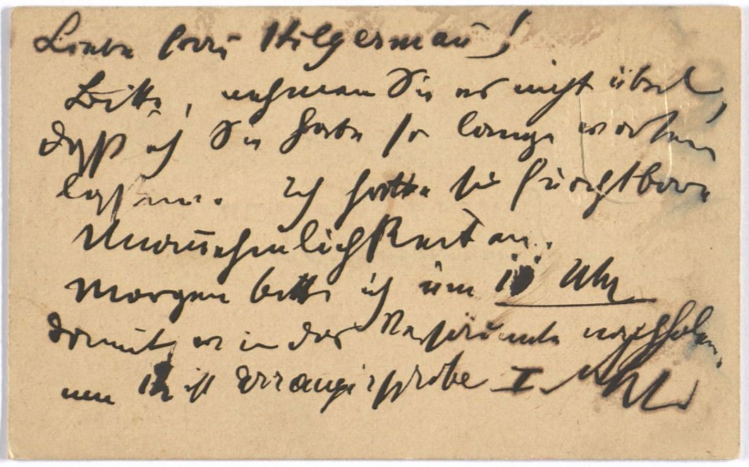 Hamburg. Business card Gustav Mahler (1860-1911) for Liebes Fraulein. 1/2