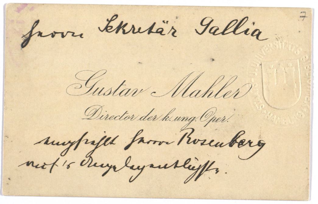 Hamburg. Business card Gustav Mahler (1860-1911) for Sekretar/Secretary Gallia. Might be Moritz Gallia (1858-1918). 1/2 (Rosenberg)