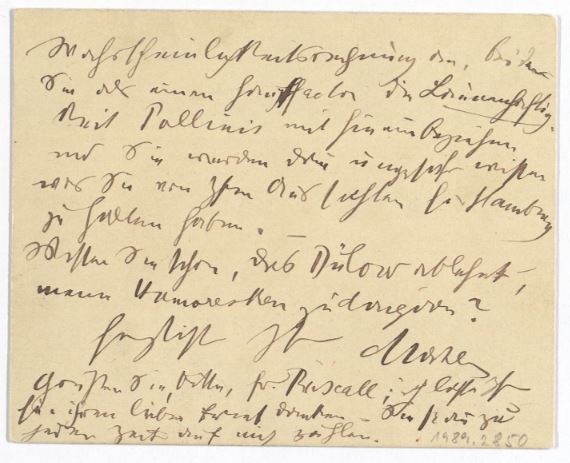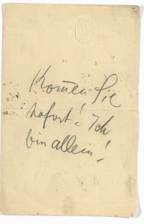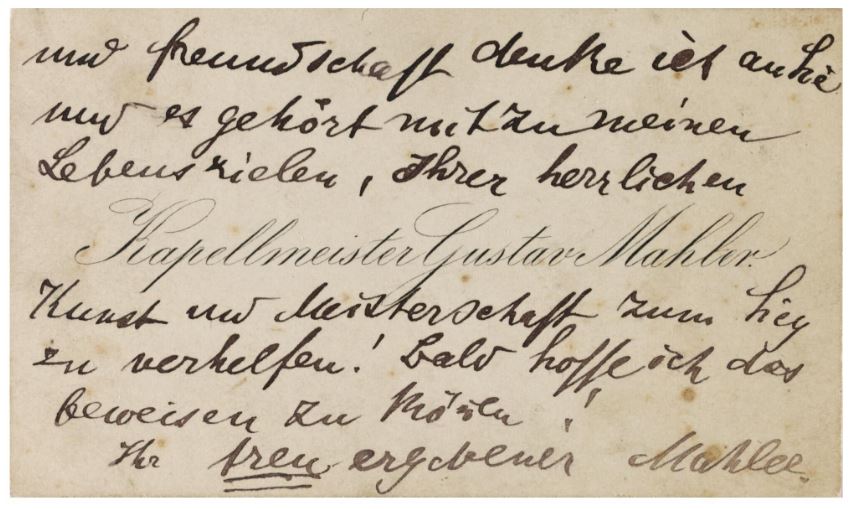 Business card Kapellmeister Gustav Mahler (1860-1911). Printed visiting card signed and inscribed (‘Mahler’) with a fifteen-line autograph message to a conductor, conceding that he has annoyed him for some time, and that he has been buffeted by the waves of fortune, but that, although life is still tempestuous, he hopes to be able to devote himself to serving those excellent artistic qualities in the recepient which he has always admired.